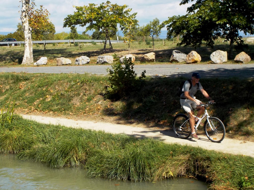 We had a great outdoor dinner under the trees with Jim and Chris at La Table du Vigneron. After a restful night on the boat, we discovered that two of our bicycles had been taken from our boat. The company replaced our bicycles, and off we went on the beautiful canal with our captain Jim navigating. After a stop in Argeliers where we visited the Cave Marcelin Albert winery, our overnight stop was Salleles d'Aude.