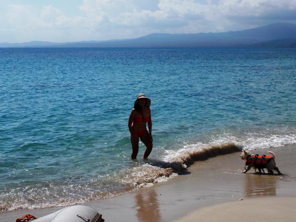 We stayed at Marina La Paz for a week. It was great to clean up the boat, get laundry done, replenish food, and get the autopilot repaired. We took a five day trip to Isla Espiritu Santo (a marine park) and Partida Island, about a three hour boat trip from La Paz. We often had anchorages to ourselves. The contrast of tall cliffs and the clear, blue waters was dramatic. The water was warm, about 85 degrees F, and there was an abundance of marine life: sea lions, dolphins, rays, turtles and so many species of fish and crustaceans. We enjoyed snorkeling and swimming in these waters; Sushi enjoyed the water too.