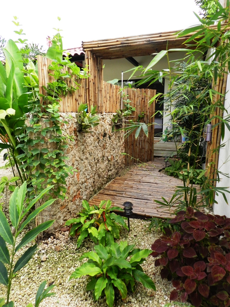 Some of our garden plants include heliconia, bamboo, orchids, palm, agave; trees such as plumeria, baalche (native), and fruit such as banana, grapefruit, mandarin, avocado, lime. Here are some backyard photos: