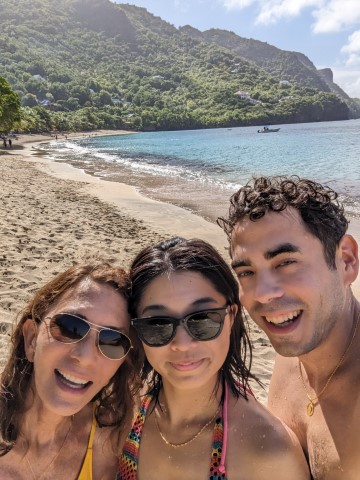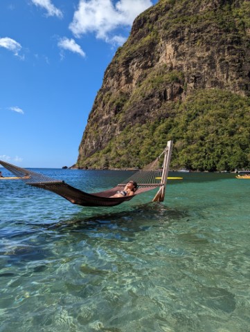 Sugar beach is a small beach between the Pitons and the Viceroy Hotel is located here. It's a stunning location. We couldn't use the beach chairs as it's a private resort, so we relaxed on our beach towels, and Armand and Natsuki enjoyed the water.