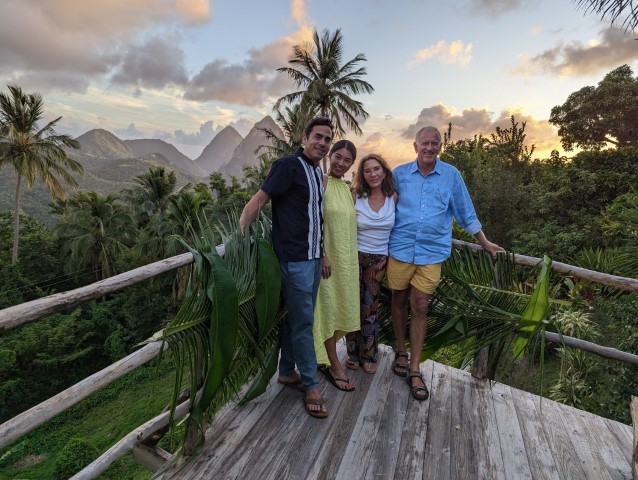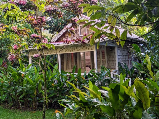 Fond Doux eco resort is located on a historic 19th century working cocoa estate. There are 17 cottages throughout the expansive trails and gardens. Pat and I stayed in Bamboo cottage, and Natsuki and Armand stayed in African Tulip cottage. The cottages are rustic but cute, with open air showers. We enjoyed exploring the resort, and we hiked on their trail which had a view of the Pitons.The food is very good, and we especially enjoyed their breakfast buffet with cocoa tea. The resort provided nightly live entertainment; on our last night, we danced.