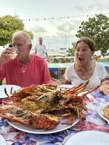In the evening, we were picked up by motor boat to go to the lobster buffet on Petit Rameau for dinner. There were many picnic benches adjacent to the outdoor kitchen, and many yachties attended. The platter of lobster was generous, and the sides were very good. We brought the white wine Armand gifted us for dinner. It was delicious and memorable evening!
