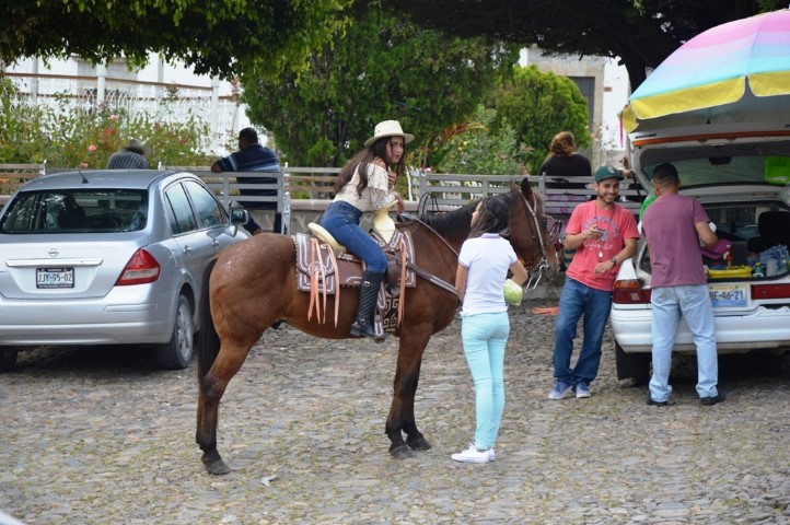 During our stroll, we took photos of a pretty young woman on a horse visiting the village square.